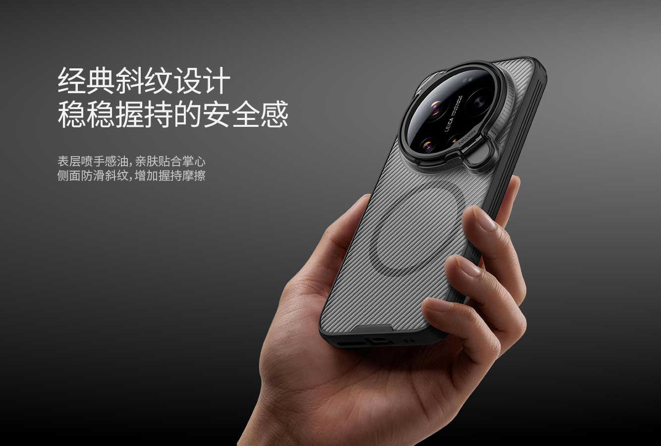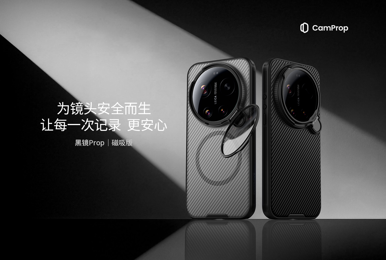 黑镜系列,源自对时尚与生活的态度,多种经典、时尚、保护元素碰撞,成就别致的都市风格。 黑镜Prop手机壳(磁吸版),延续时尚经典斜纹设计,搭配相机元素镜头保护盖,全新演绎经典风尚;翻盖式炫光CD纹镜盖,精致耀目,可提供支架功能;内置强力磁铁,尽享MagSafe磁吸便捷体验。双重材质全包保护,辅与四角抗摔气囊,抗震防摔;表层涂喷手感油,入手亲肤,防指纹油污;侧边增加防滑条,手持更稳更舒适。