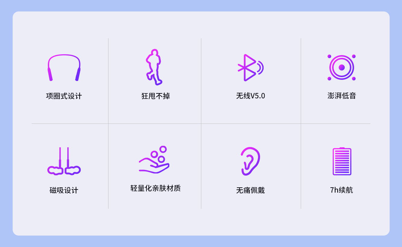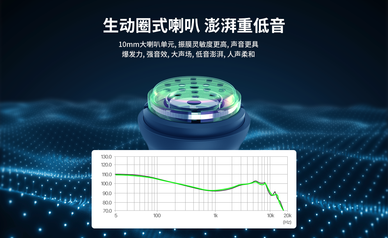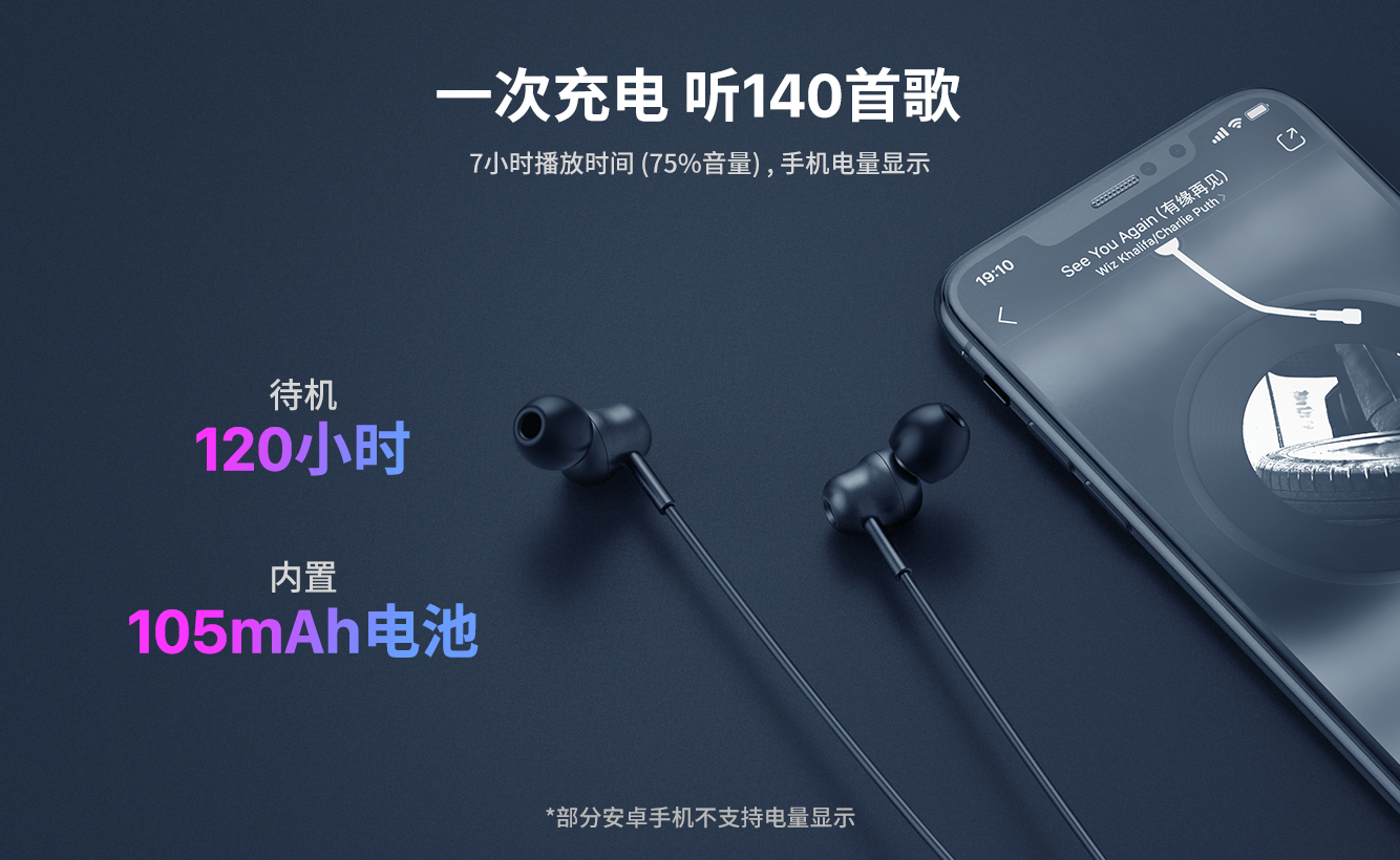 采用无线V5.0无线方案,10mm大单元,缔造澎湃低音,同时清晰传递柔美人声,听得见的好声音。轻量化亲肤材质,搭载7h续航,IPX4防水防汗,久戴无累感,让你无论雨天晴天,无论休闲抑或运动,想听就听,无“线”自由!