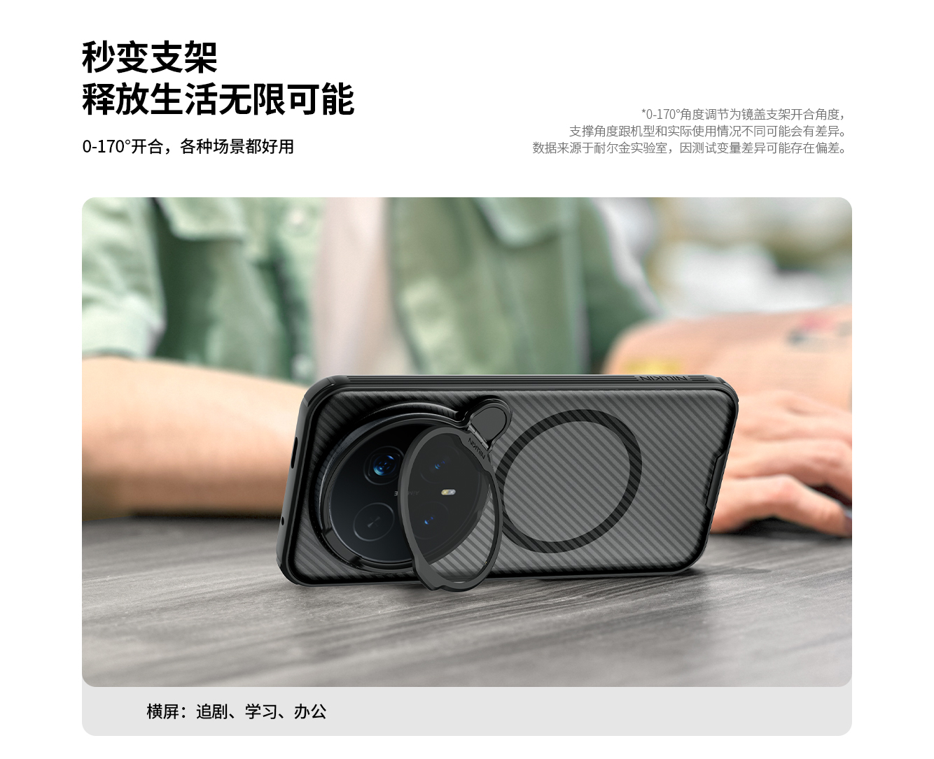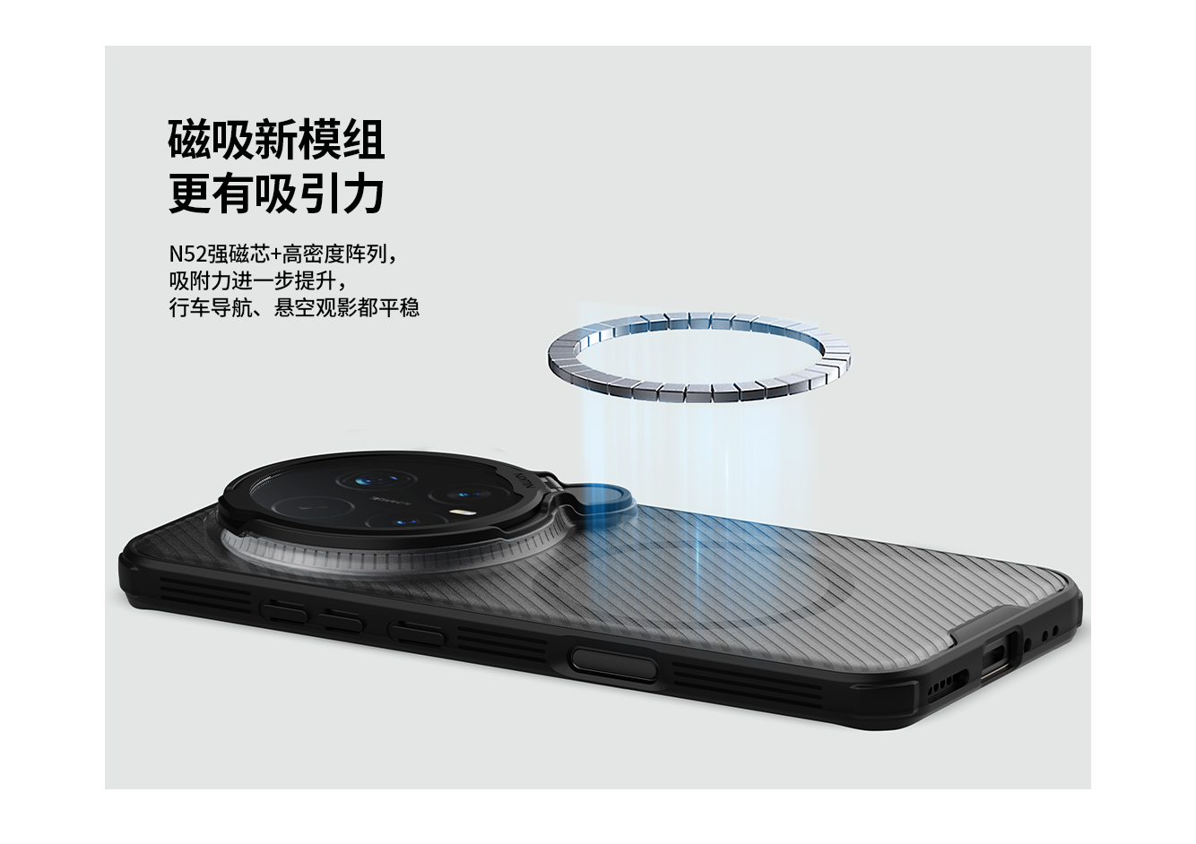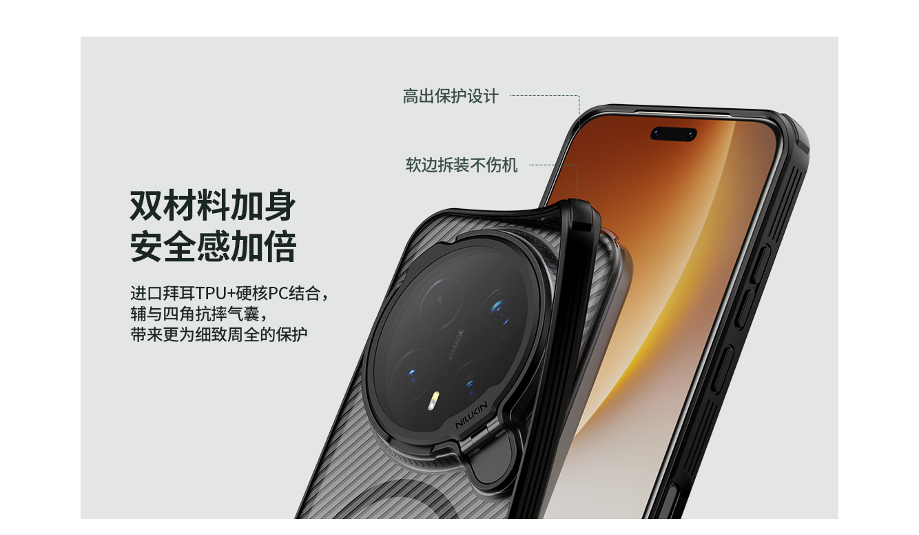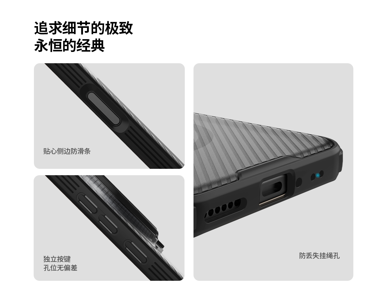 Nillkin经典系列重塑升级,延续灵魂斜纹元素,以微透设计,探索极致视觉体验; 表层手感油处理,亲肤细腻;透明镜盖支架,兼顾镜头保护与手机支撑功能,不阻挡日常拍摄、扫码;升级磁力模组,稳固更便捷;进口环保TPU+PC一体成型,全方位无忧防护。